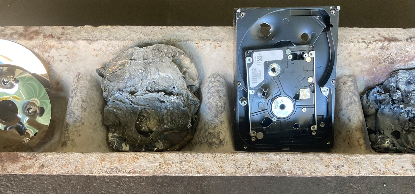 HDDやSSDのケース部分は固い金属で覆われているため、通常の廃棄では完全な破壊は容易ではありません。当社では専用の装置を用い媒体を物理的に完全に破壊します。